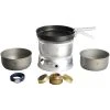 Alcohol stove kit with 2 non-stick 1 L saucepans, graduated and ungraduated, 1 non-stick frypan (7.25″), and one 0.6 L aluminum kettle.
